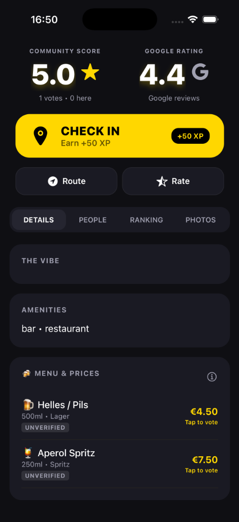 The most important feature: A live map showing all bars with real-time beer prices—both per beer and per liter. See how many people and friends are at each bar before you go.